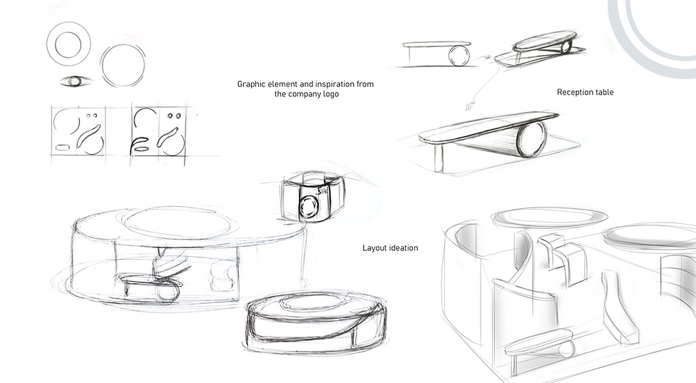 A space that will include within it- Reception Counter, Storage, Demo area + touchscreen, Semi secluded meeting area, and 50’’ screen for corporate videos